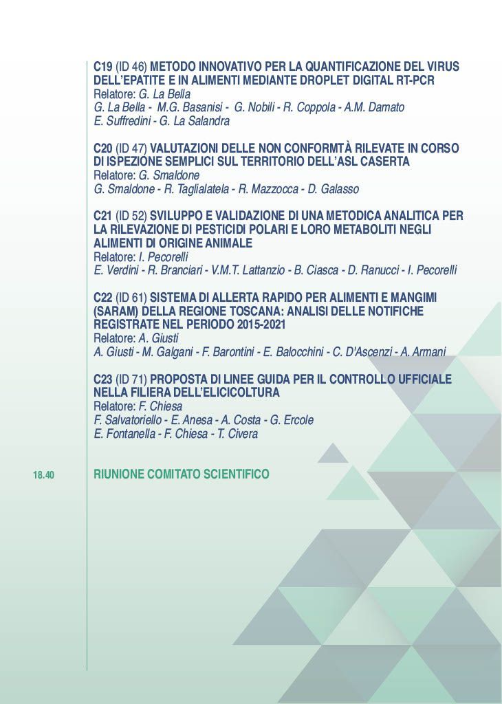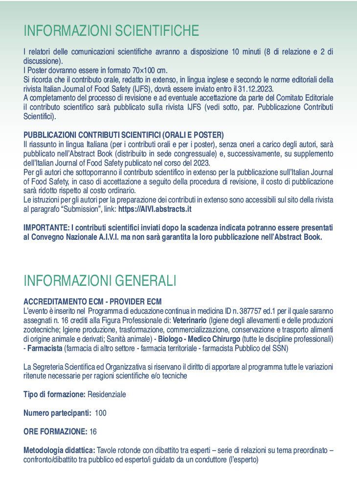Si ricorda che il contributo orale, redatto in extenso, in lingua inglese e secondo le norme editoriali della rivista Italian Journal of Food Safety (IJFS), dovrà essere inviato entro il 31.12.2023.