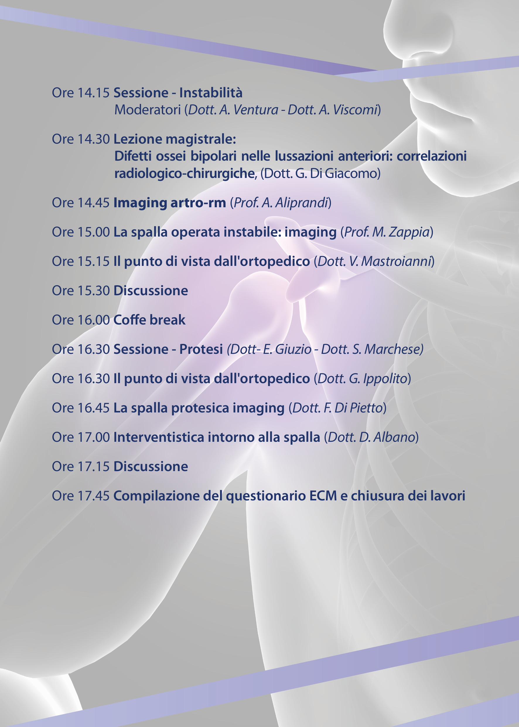 - Causale: MASTERCLASS SPALLA, corso avanzato di imaging RM e ARTRO-RM e correlazioni clinico-chirurgiche sala convegni hotel Marechiaro Gizzeria (CZ) 30 GENNAIO 2026.
