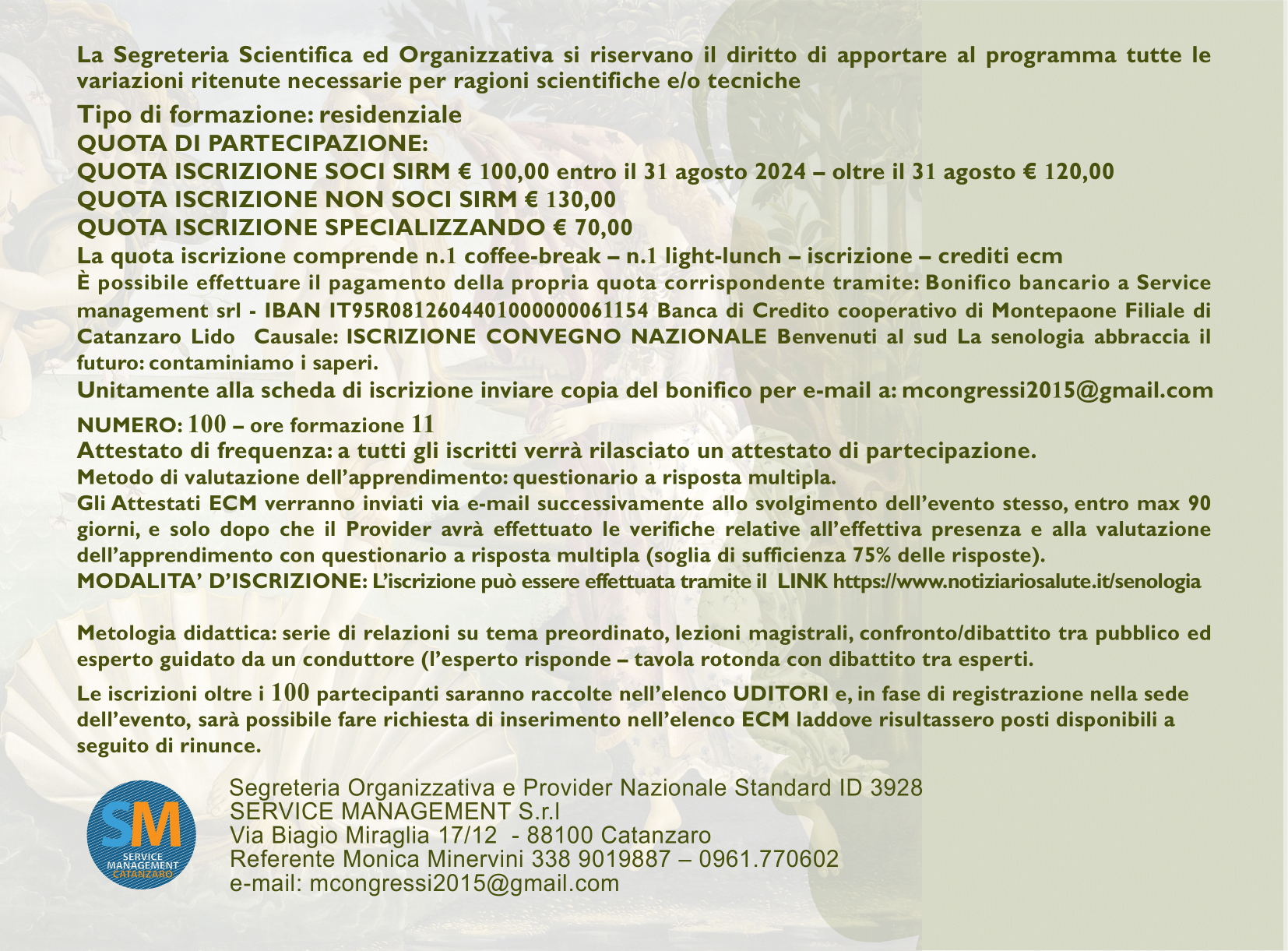 Segreteria Organizzativa e Provider Nazionale Standard ID 3928 SERVICE MANAGEMENT S.r.l - Via Biagio Miraglia 17/12 - 88100 Catanzaro Referente: Monica Minervini 338 9019887 – 0961.770602 e-mail: mcongressi2015@gmail.com